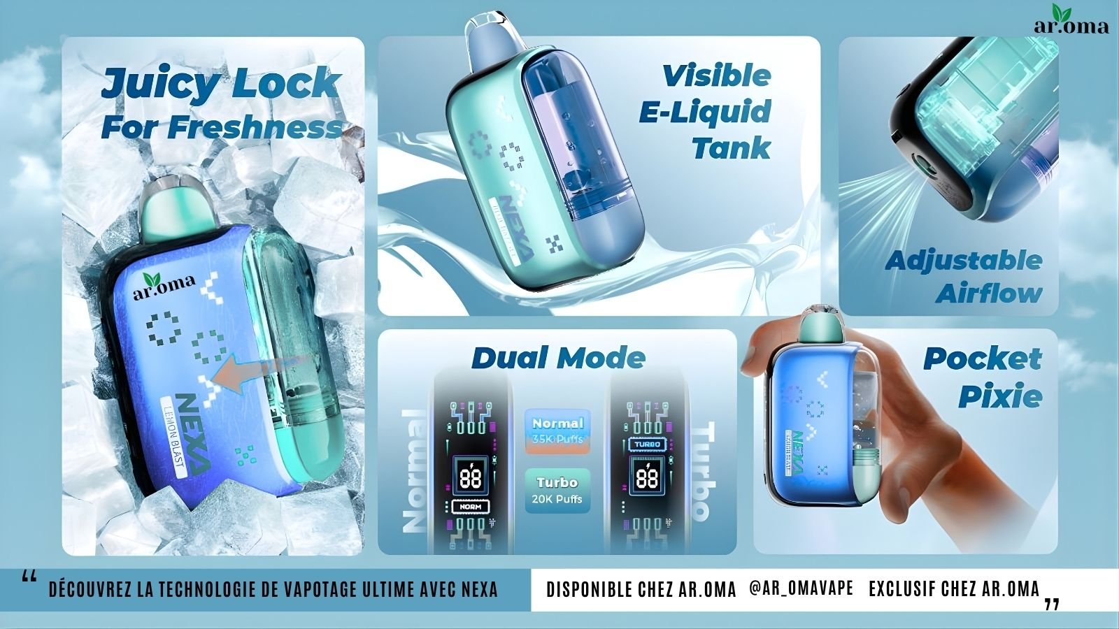 Le NEXA PIX 30K est équipé d'un système de résistance double mesh pour une vapeur constante et une saveur intense.Le mode Smooth pour jusqu'à 30 000 bouffées ou le mode Turbo pour environ 20 000 bouffées .intelligent affiche l'autonomie de la batterie, le nombre de bouffées et le niveau de e-liquide en temps réel.
